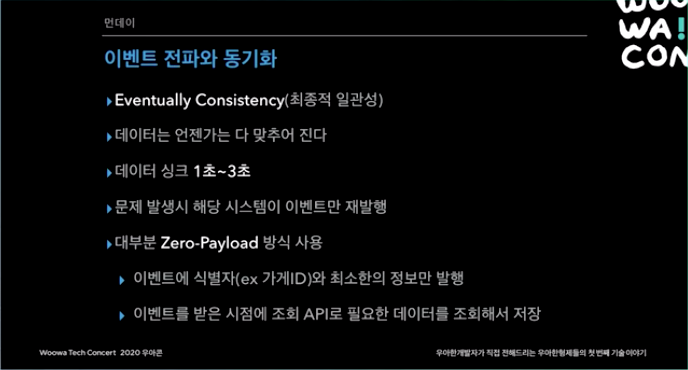 - 이벤트 순서를 고민할 필요가 없다. 가게 연락처를 A로 바꿨다가 B로 바꿨다고 해보자. 근데 무조건 이 순서로 오지 않는다. B가 먼저 올 수도 있다. 이게 페이로드로 담겨서 오면 순서가 바뀔경우 문제가 있을 수 있지만, Zero-payload 사용시 어짜피 최종 데이터를 가게/업주 서비스가 갖고 있기 때문에 문제가 되지 않는다.