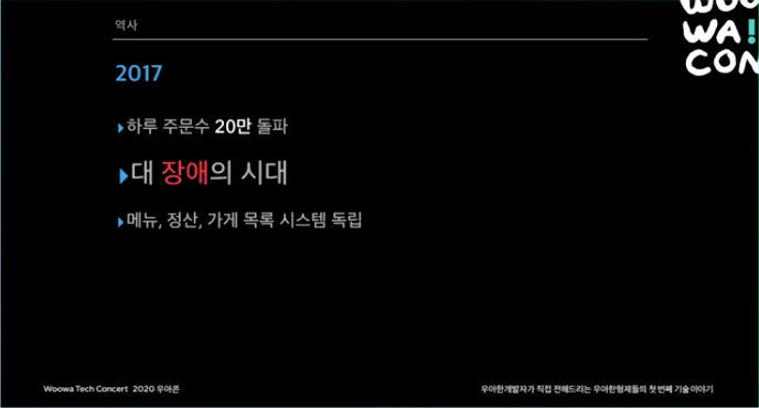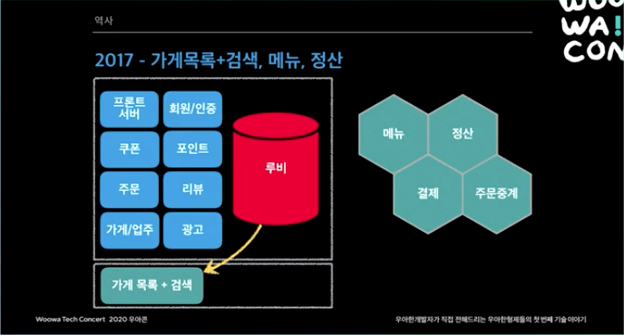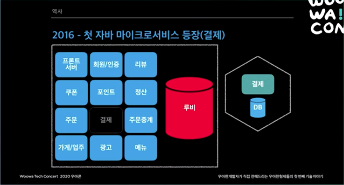 2015년. 처음에는 모놀리틱 서비스 였다. 리뷰 시스템쪽에 장애가 나더라도 시스템 전체가 먹통되는 일이 생기곤 했다. 하루 주문수 10만건이 넘어가면서 마이크로서비스 도전을 시작했다.