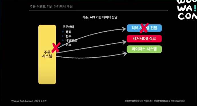 태초 주문 시스템은 API 기반이었음. 하지만 리뷰 시스템에 장애가 나면 주문 시스템도 이를 처리 하지 못하고 장애가 났음.