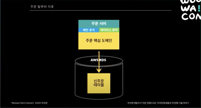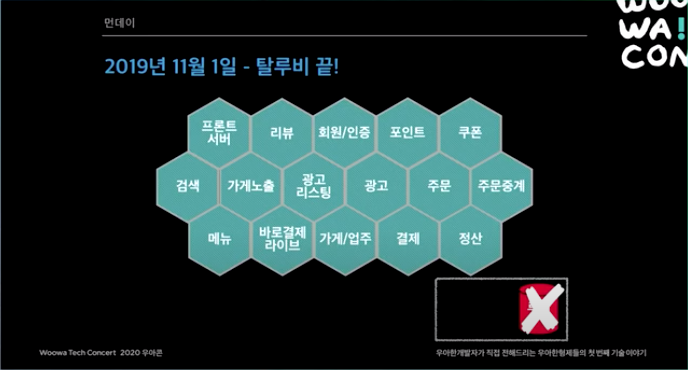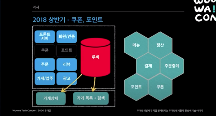2015년. 처음에는 모놀리틱 서비스 였다. 리뷰 시스템쪽에 장애가 나더라도 시스템 전체가 먹통되는 일이 생기곤 했다. 하루 주문수 10만건이 넘어가면서 마이크로서비스 도전을 시작했다.