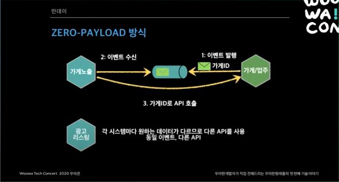 - 이벤트 순서를 고민할 필요가 없다. 가게 연락처를 A로 바꿨다가 B로 바꿨다고 해보자. 근데 무조건 이 순서로 오지 않는다. B가 먼저 올 수도 있다. 이게 페이로드로 담겨서 오면 순서가 바뀔경우 문제가 있을 수 있지만, Zero-payload 사용시 어짜피 최종 데이터를 가게/업주 서비스가 갖고 있기 때문에 문제가 되지 않는다.